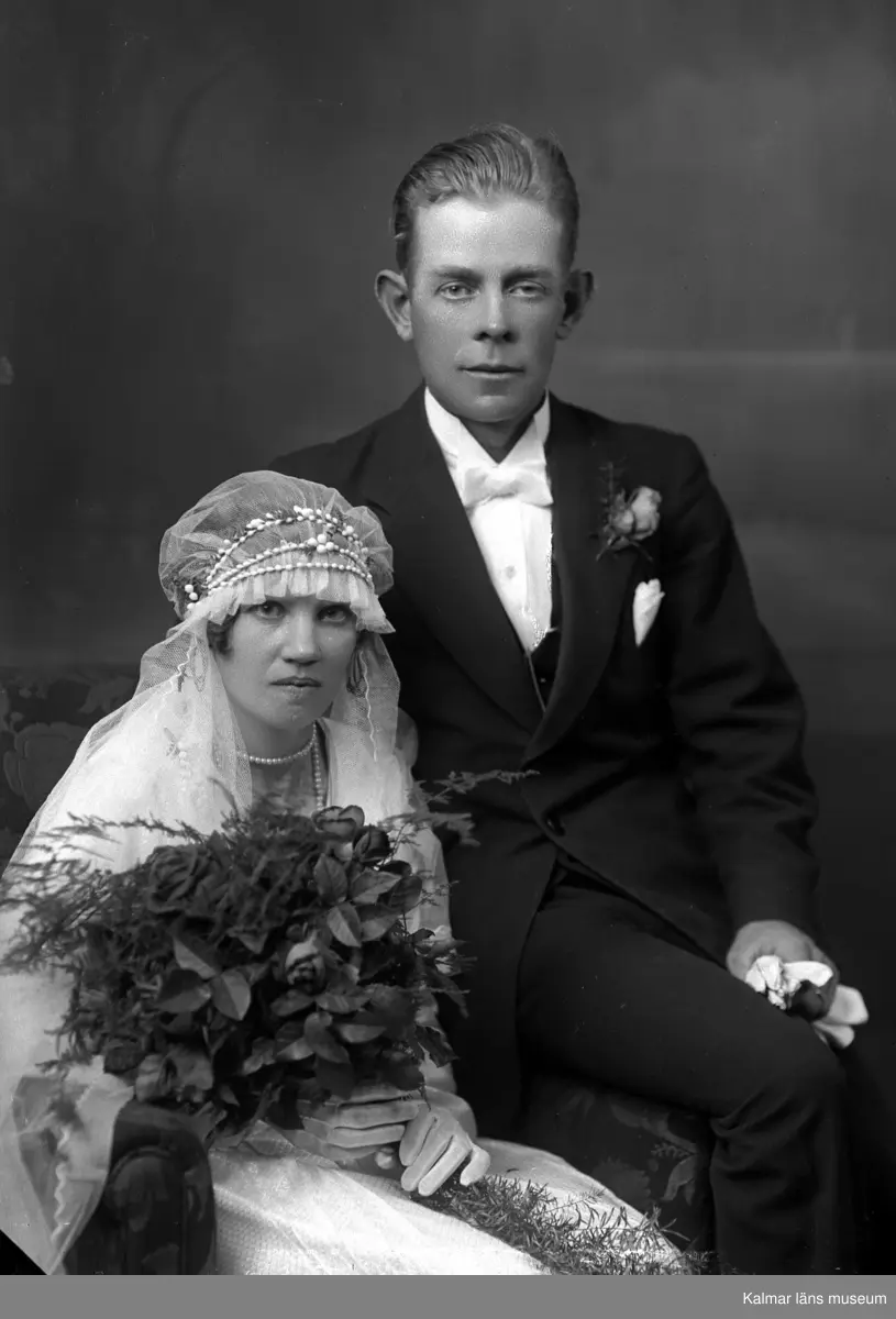 Bröllopsbild. En kvinna i brudklänning hållandes i en blombukett och en man i kostym. Enligt Walter Olsons journal är bilden beställd av Arvid Håkansson.