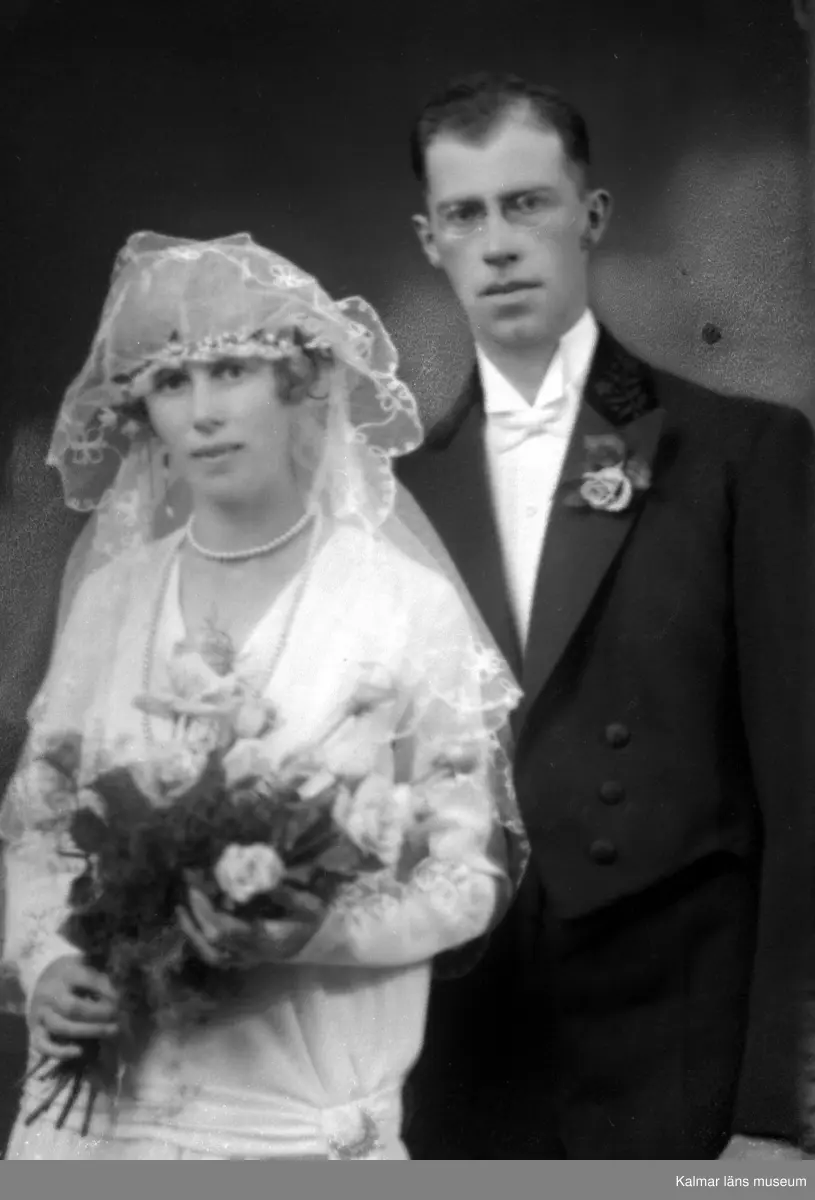 Bröllopsbild. En kvinna i brudklänning hållandes i en blombukett och en man i kostym. Enligt Walter Olsons journal är bilden beställd av magister H Lindström.