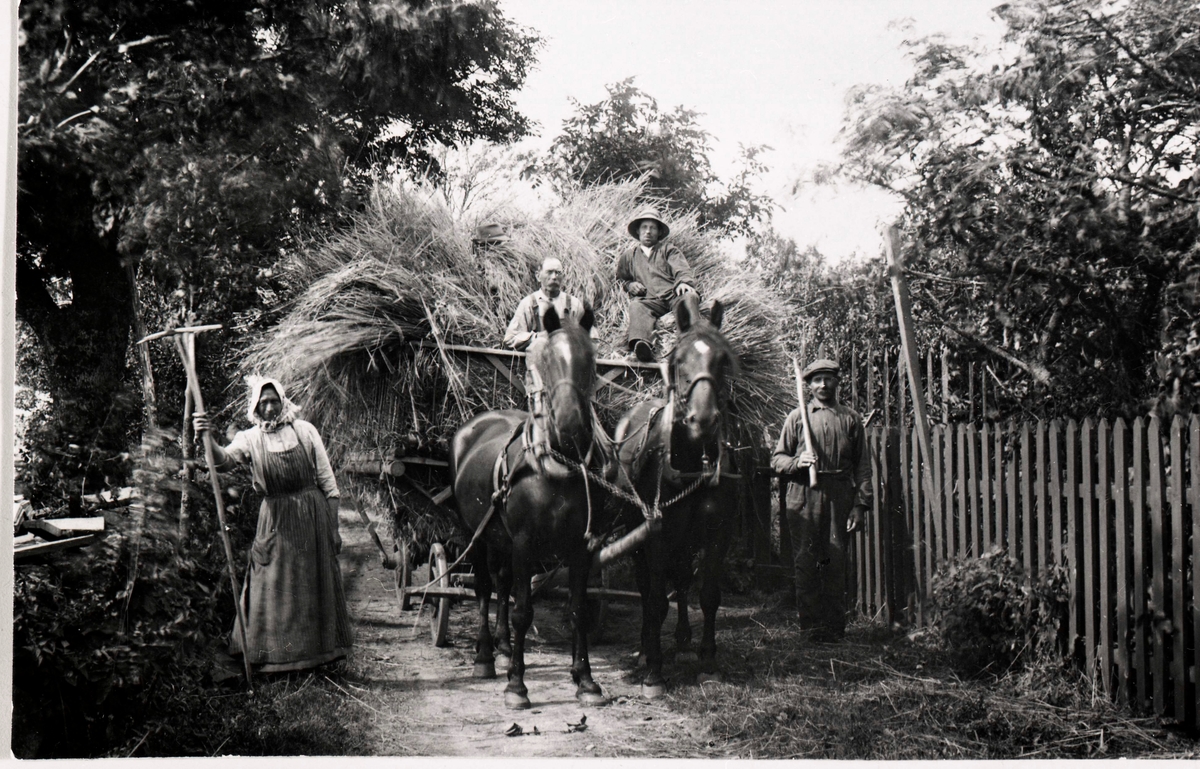 Skördefolk som låtit sig fotograferas med hästar och skrinda, i Nedra Sandby.