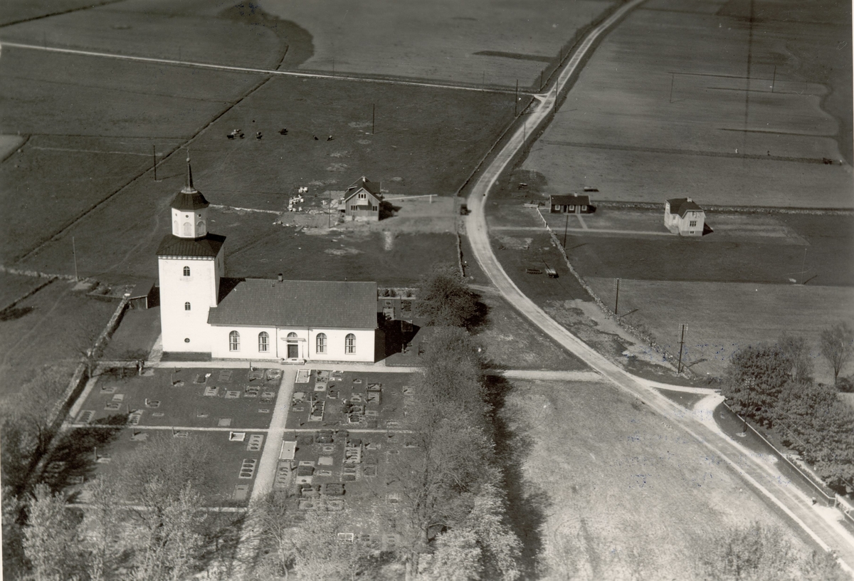 Flygfoto över Bredsättra kyrka omgiven av odlingslandskap.