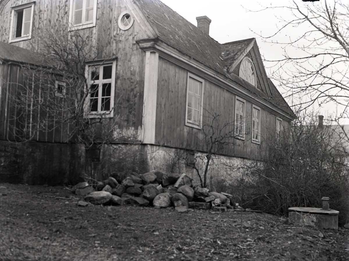 Ett bostadshus med takkupa, träfasad och stengrund.