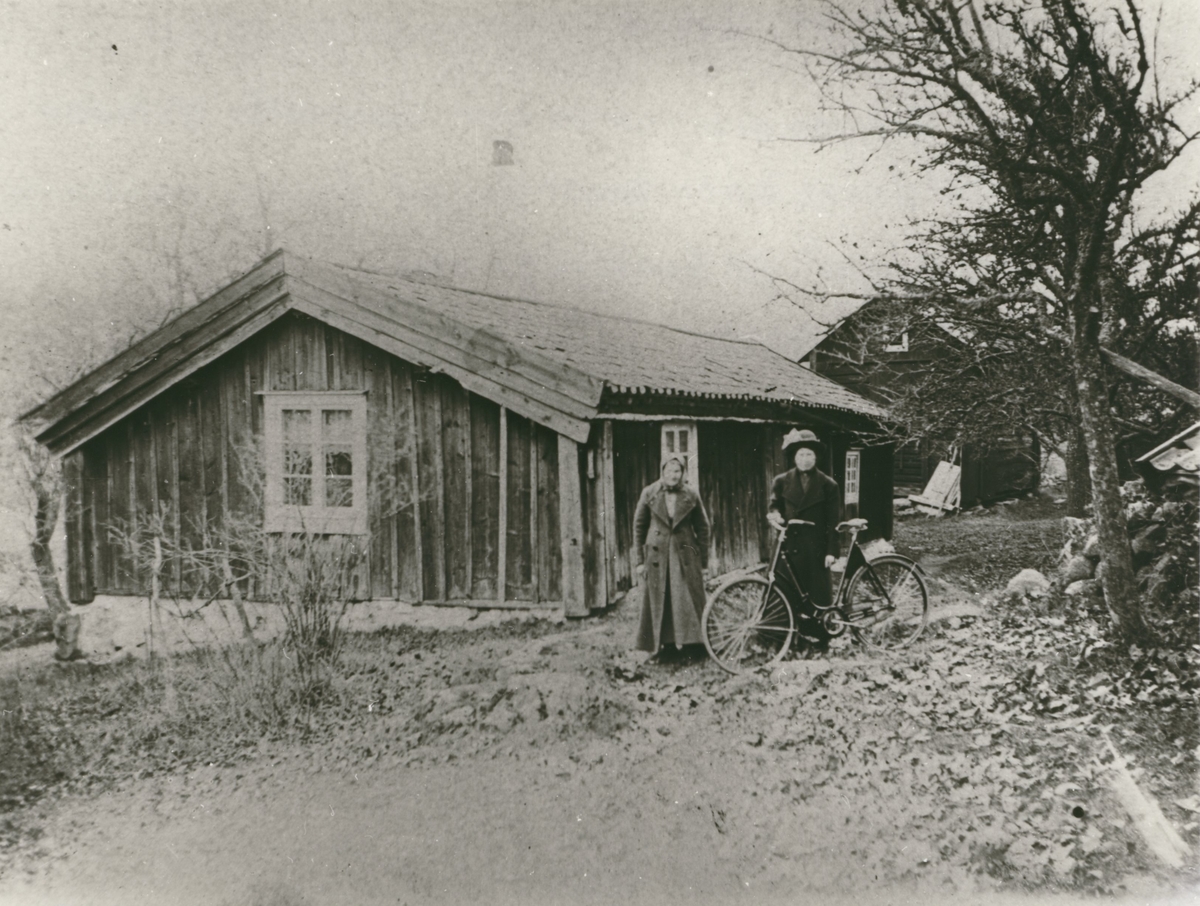 Judet Nilsson och hennes mor Sara Lotto Nilsson utanför deras barndomshem på Grönö, nuvarande "Grönöstugan" på hembygdsgården.