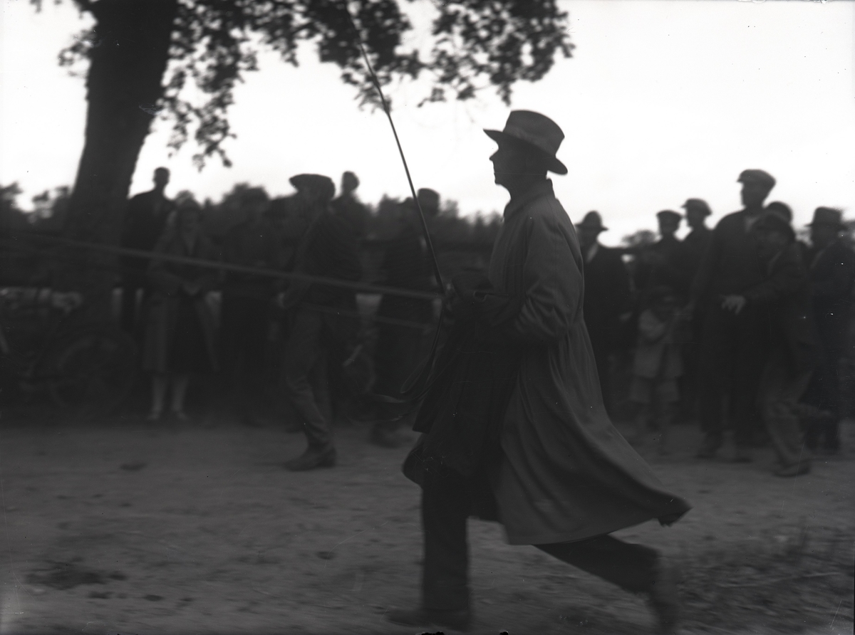 En man tömkör en häst. Tömmarna syns, men inte hästen.