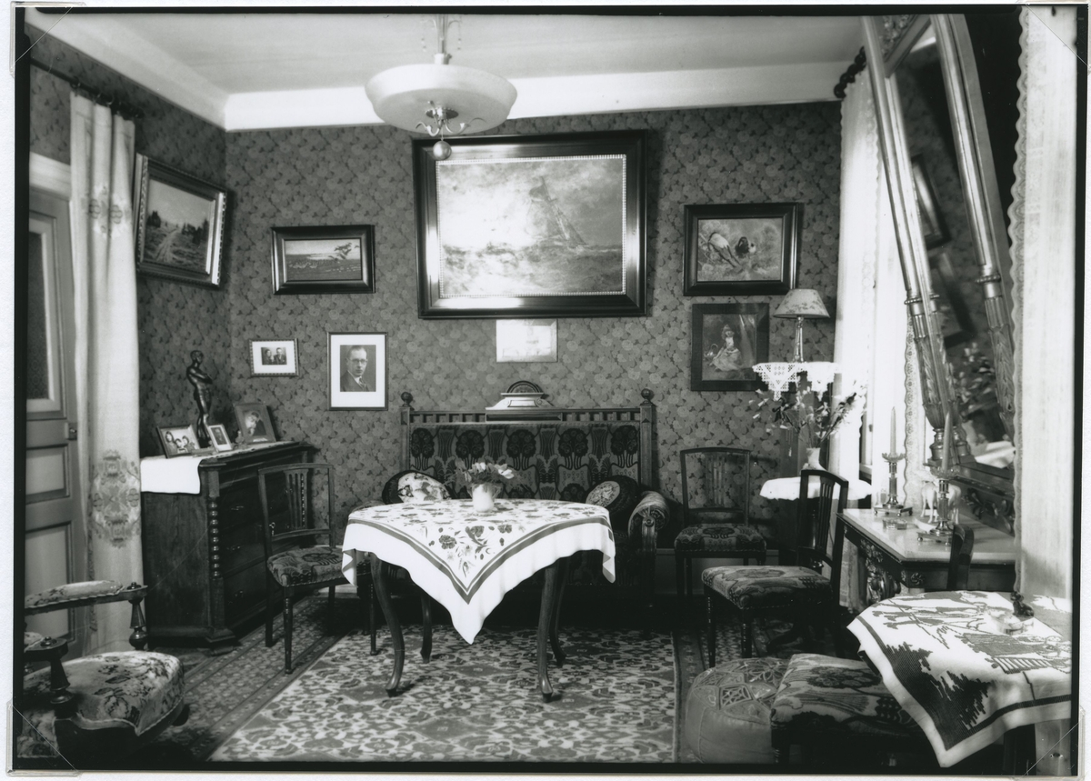 Interiör. Rum med bland annat ett bord med duk, soffa, tavlor och stolar.