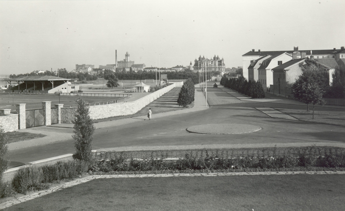 Fredriksskansgatan med idrottsplatsen till vänster omkring 1936