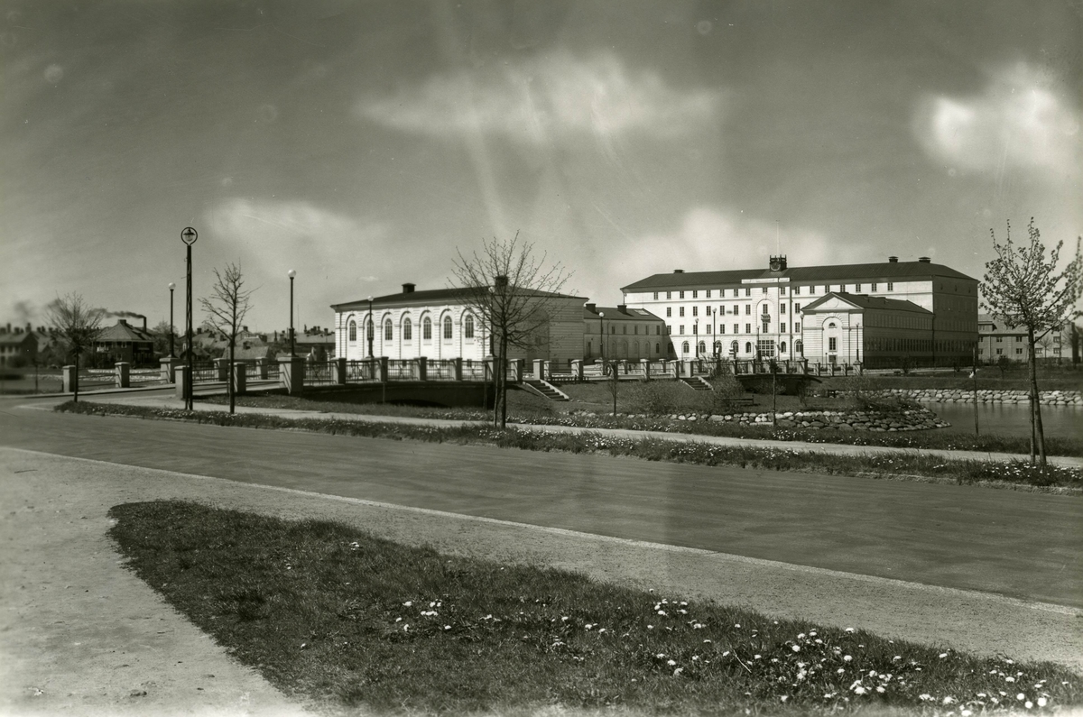 Nya läroverket i Kalmar omkring 1936 med Fredriksskansbron i förgrunden.