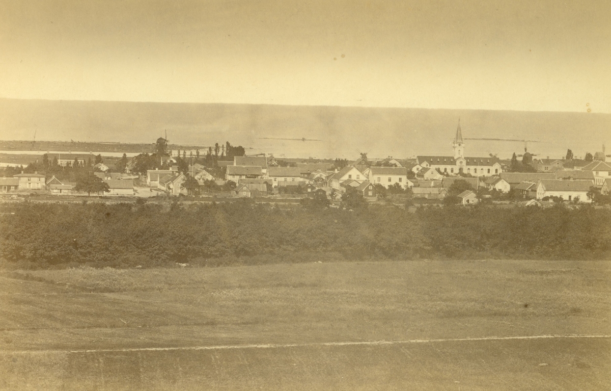 Bild tagen från slottsruinen, troligen vid förra sekelskiftet eller strax innan, då staden ser mycket lantlig ut men kyrkan är färdig.