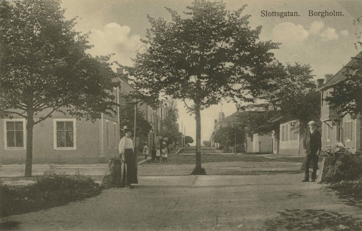 Vykort som visar Slottsgatan i Borgholm, någon gång i slutet av 1800-talet eller början av 1900-talet.