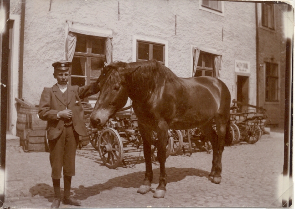 Bryggeriet Nordstjernan. Fodermästare Nilssons fosterson tillsammans med hästen Emmy, cirka 1900.