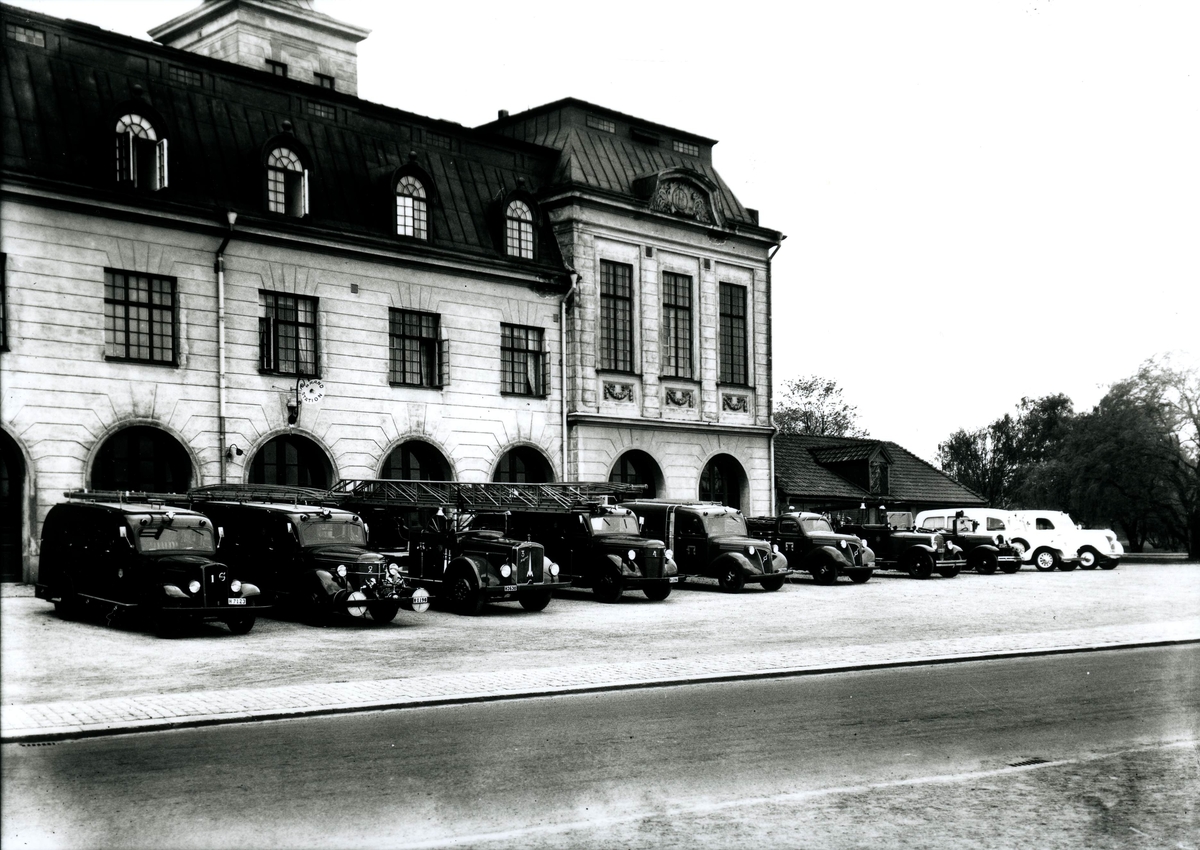 Brandkåren i Kalmar. Brandbilar och ambulanser uppställda framför brandstationen, nummer tre är den första stegbilen, av märket Magirius.