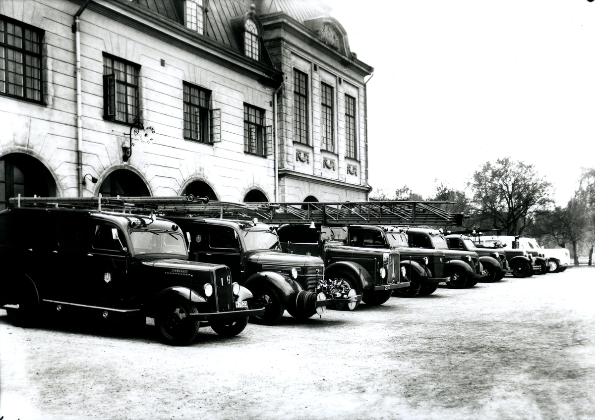 Brandkåren i Kalmar. Brandbilar och ambulanser uppställda framför brandstationen.