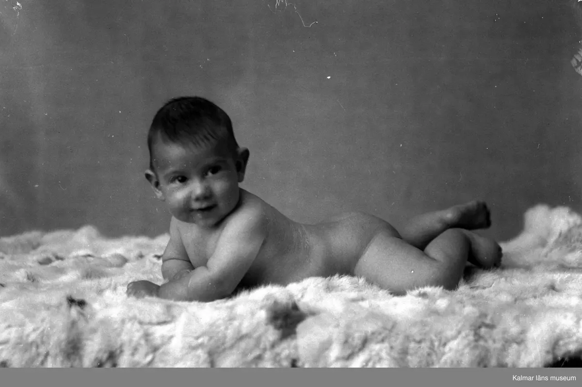 Bild på ett barn som ligger på ett fårskinnsfäll. Beställare till bilden: Fru Maja Melin ifrån Södra Långgatan 20 i Kalmar.