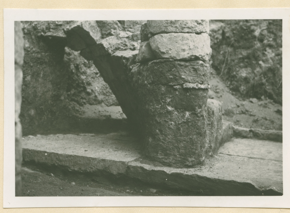 I början av 1940-talet bedrevs icke-förstörande arkeologiska utgrävningar i kv Valnötsträdet i Kalmar. Det innebär att man lämnade kvar alla fasta konstruktioner som murar och trappor, något som varit till hjälp under de utgrävningar som bedrivits under 2000-talet. Den här bilden visar en trappa strax innanför gamla grinden vid vaktmästarebostaden 1942.
