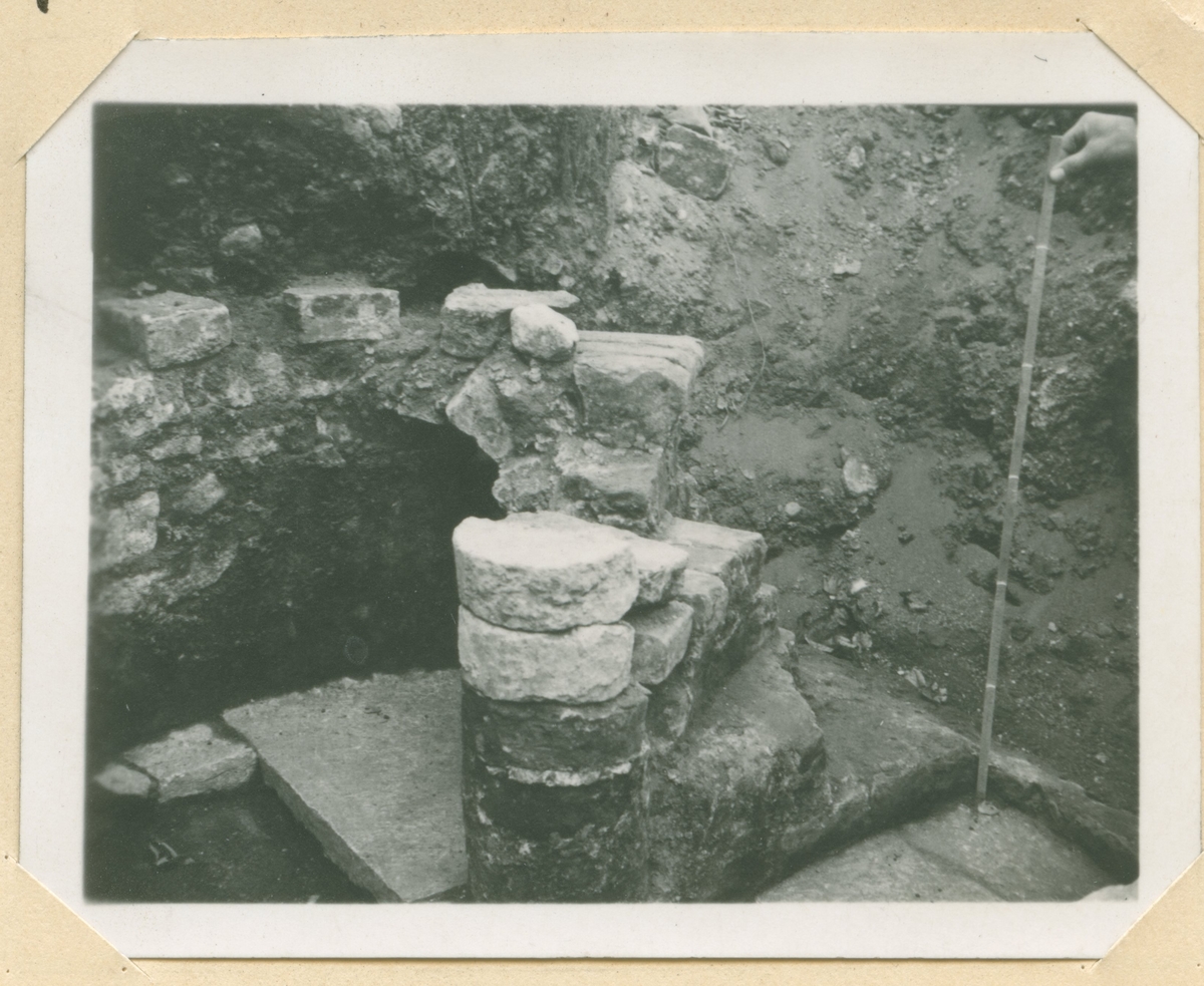 I början av 1940-talet bedrevs icke-förstörande arkeologiska utgrävningar i kv Valnötsträdet i Kalmar. Det innebär att man lämnade kvar alla fasta konstruktioner som murar och trappor, något som varit till hjälp under de utgrävningar som bedrivits under 2000-talet. Den här bilden visar en trappa strax innanför gamla grinden vid vaktmästarebostaden 1942.
