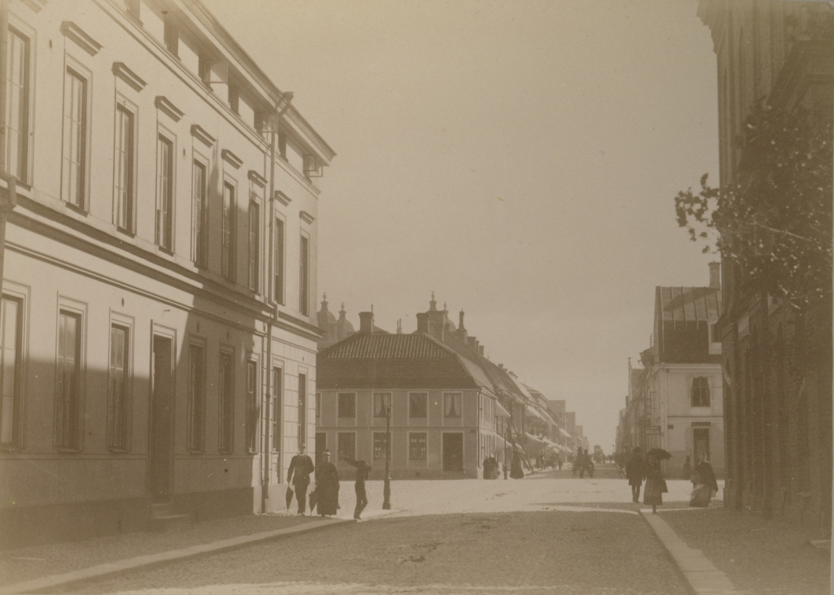 En av få stadsvyer i Kalmar som ser nästan likadan ut idag som när bilden togs. Bilden är tagen från Olof Palmes gata mot Larmtorget, med Teatern på vänster sida och Frimurarhotellet på höger. Samtliga byggnader som syns tydligt är bevarade.