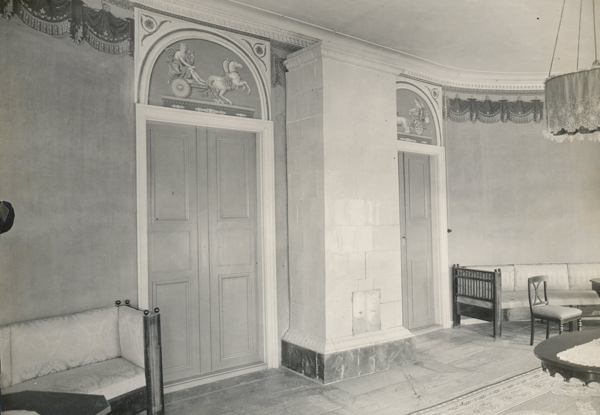 Övervåningens halvrunda salong (rum åtta). Draperiet för denna dörr som var blinddörr.