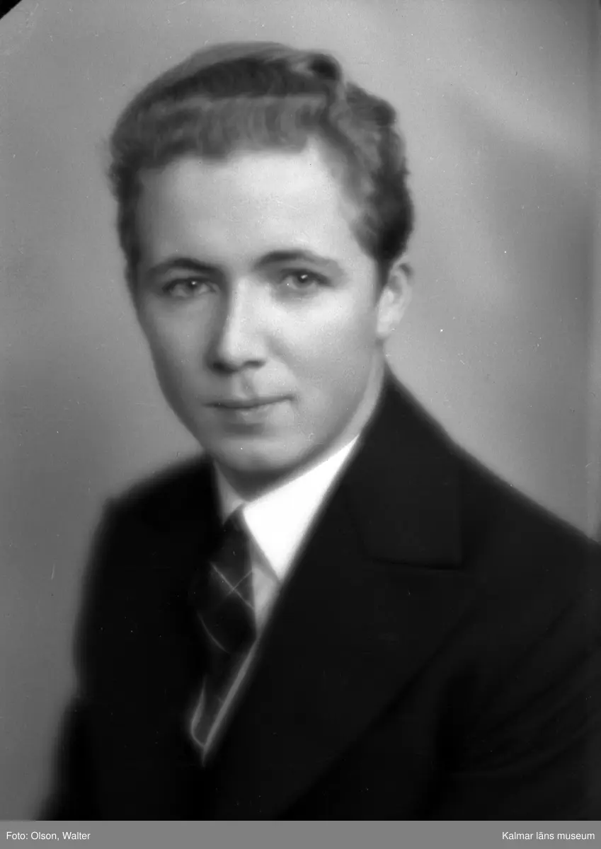Ateljébild på en man i kavaj. Enligt Walter Olsons journal är bilden beställd av herr Henry Gustavsson.