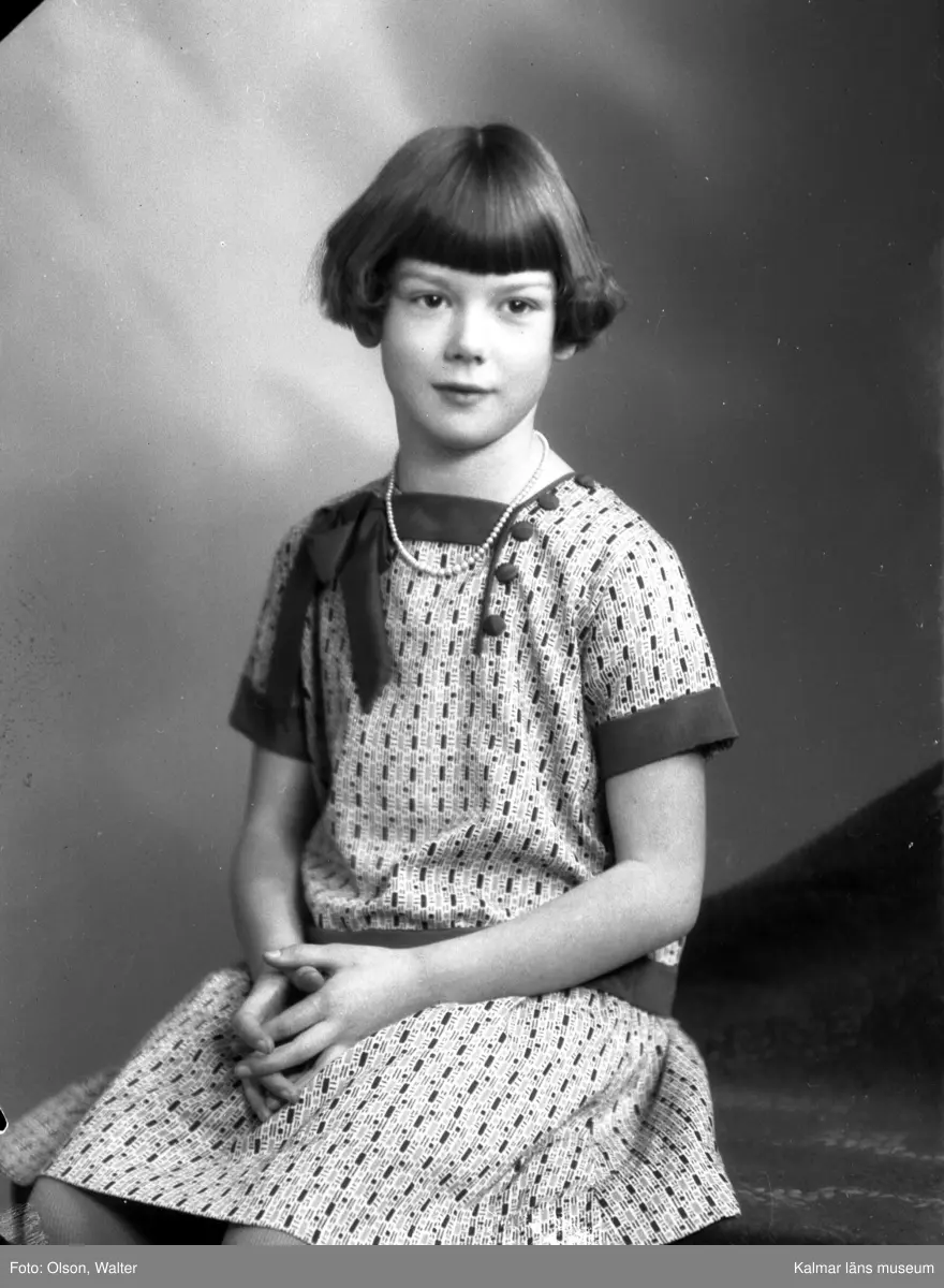 Ateljébild på en flicka i halsband och klänning. Enligt Walter Olsons journal är bilden beställd av Ingrid Karlsson.