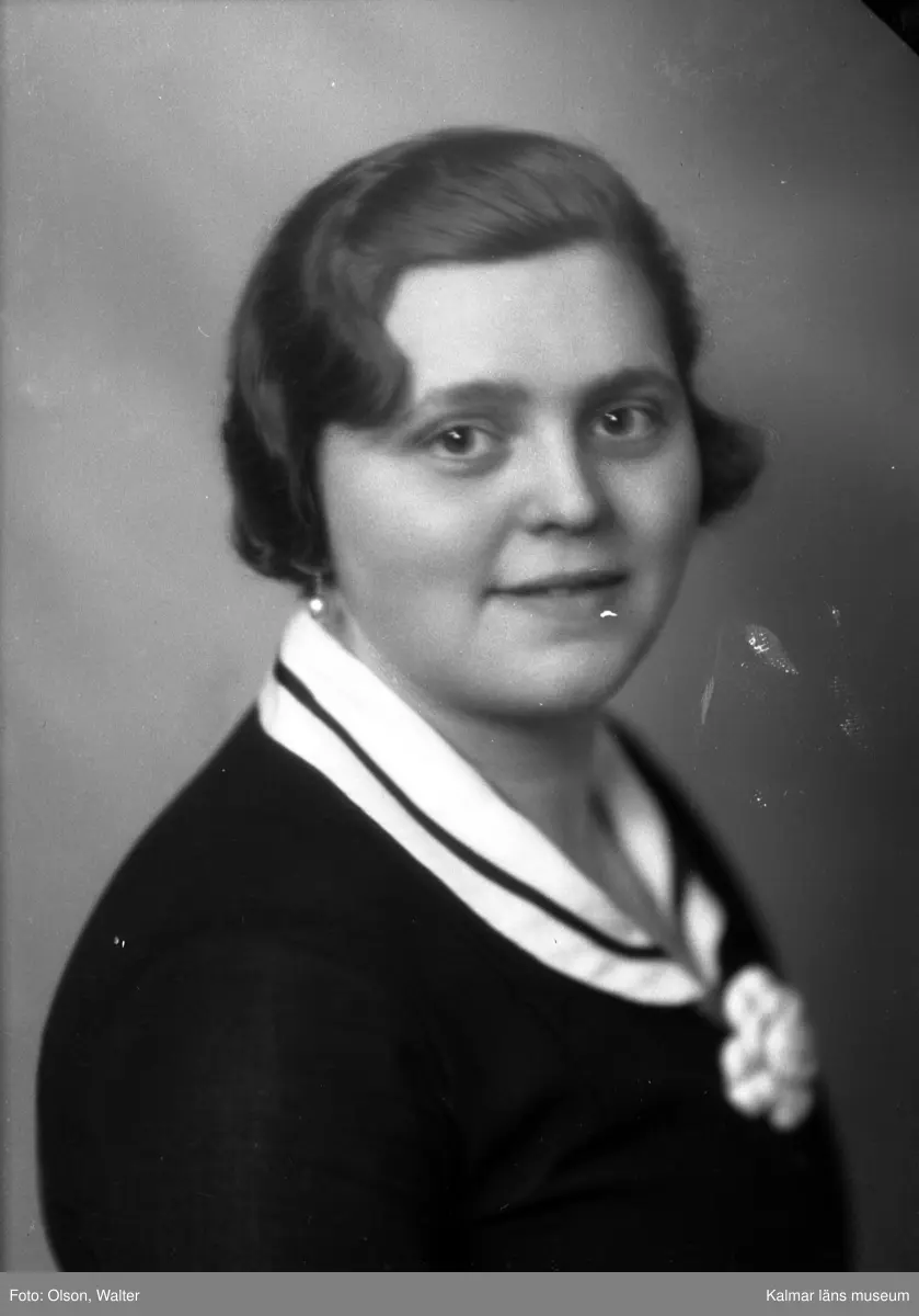 Ateljébild på en kvinna i brosch och klänning. Enligt Walter Olsons journal är bilden beställd av fröken Greta Nilsson.