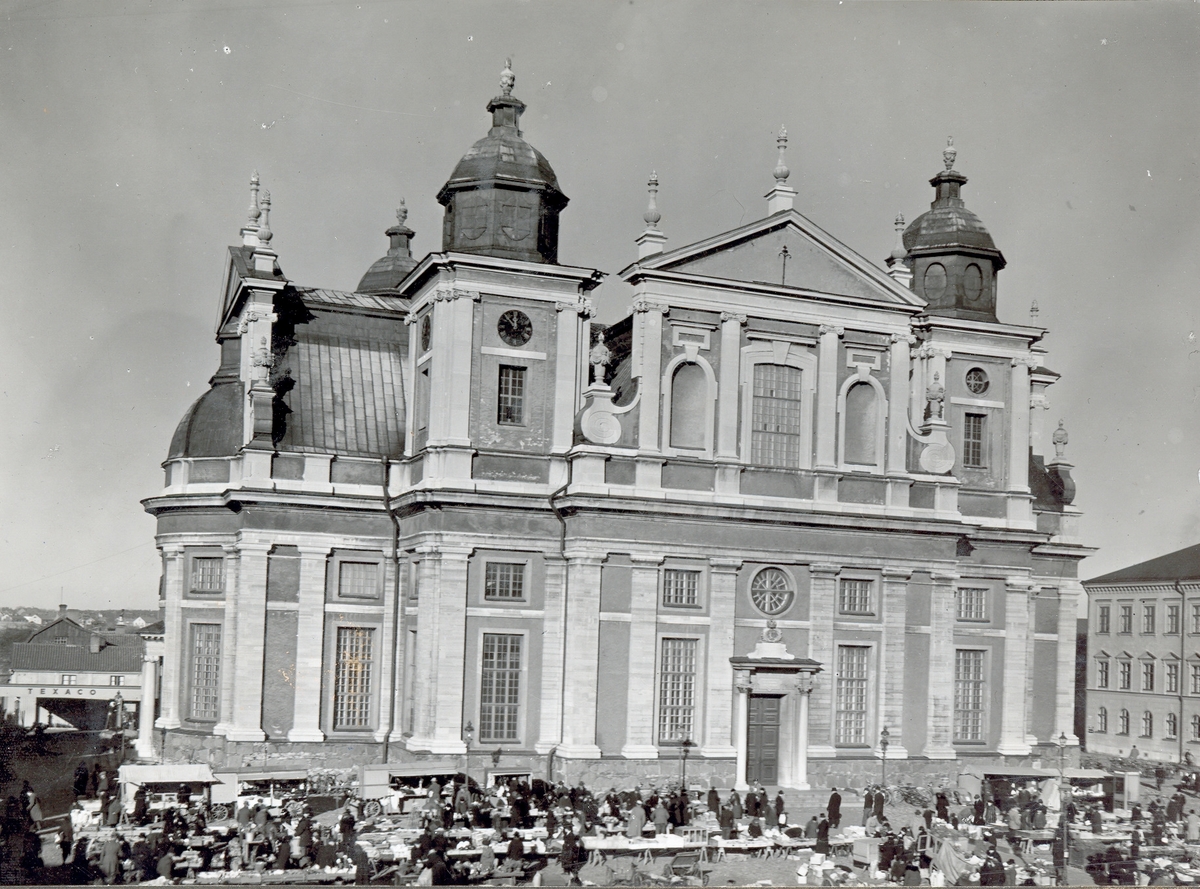 Kalmar domkyrka med torghandel på Stortorget i förgrunden.