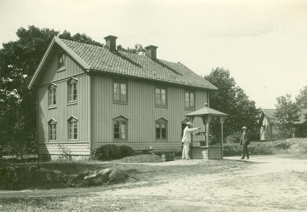 En man släcker törsten vid en brunn vid en fastighet i Ilingetorp.