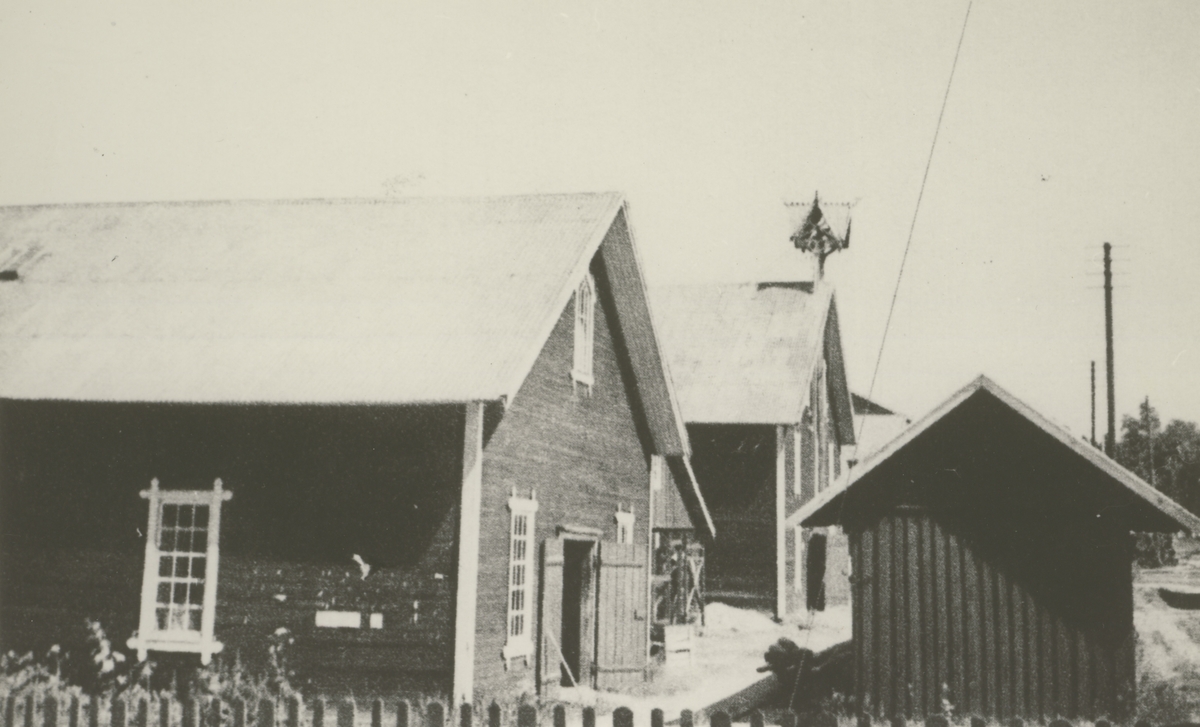 Magasinbyggnader uppförda år 1895. På taket huv med vällingklocka.