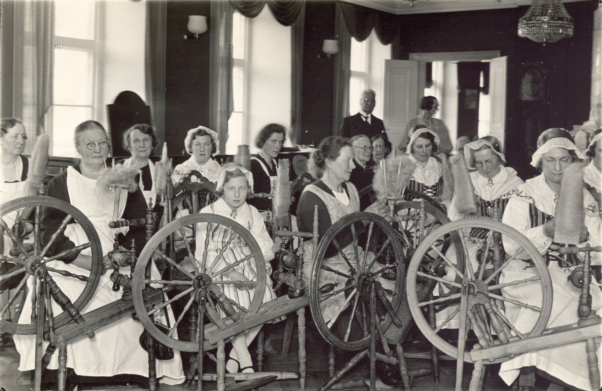 Spånadstävlan l rådhussalen i Västervik år 1936. Deltagarinnornas ålder varierar mellan 75 0ch 11 år och pris utdelades till bland andra en sjuttioåring och en elvaåring.