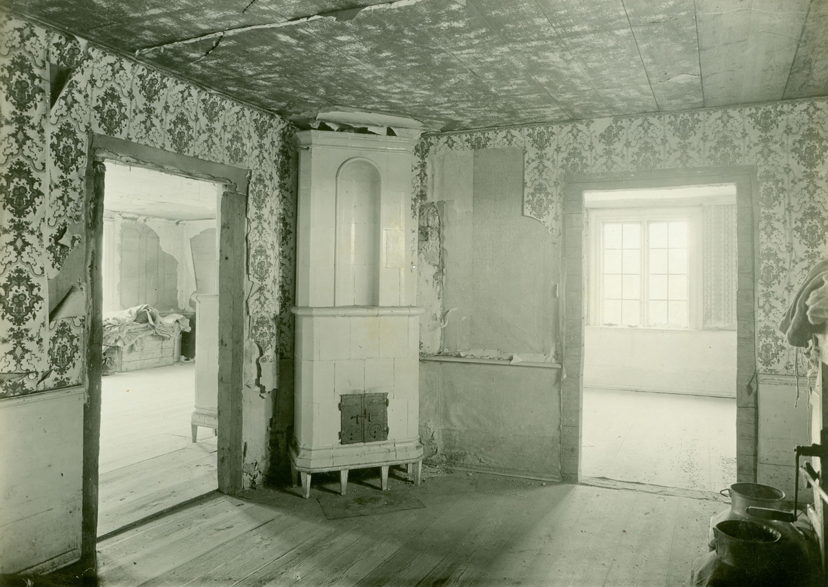 Huvudbyggningen: kammare bakom. Tapeter från 1800- talets mitt. Gul kakelugn från 1700- talets slut.