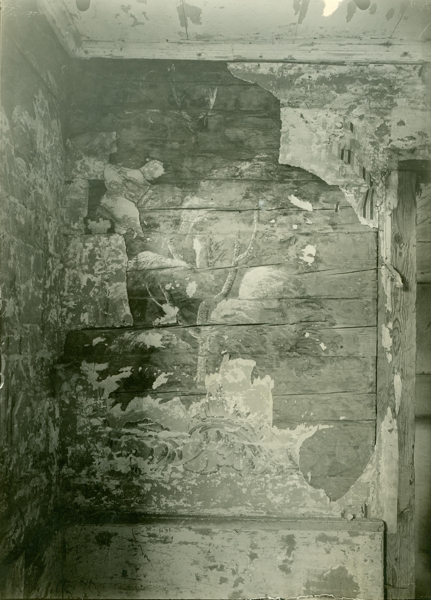 Huvudbyggningen: förstugan. På timret målning från 1700- talets förra hälft. Däröver målade rokokoornament på papp.