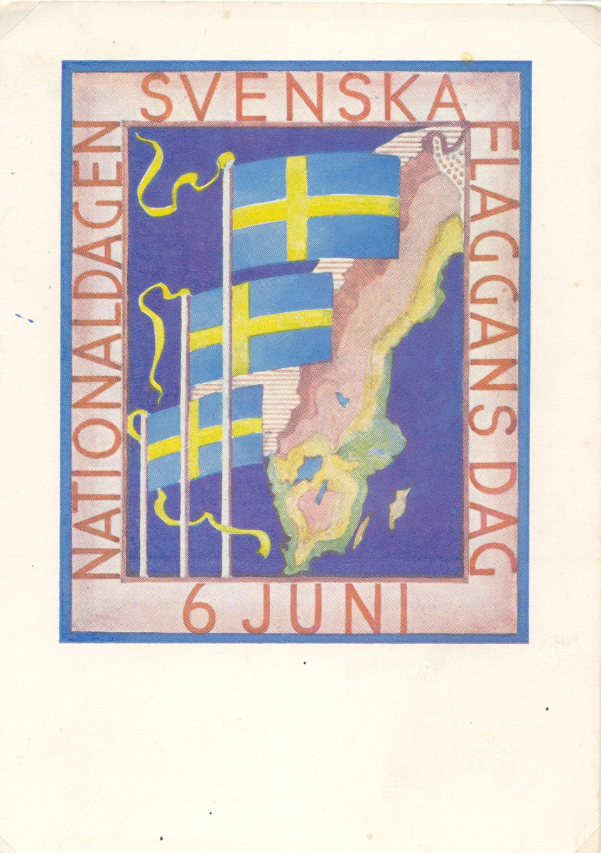 Vykort med anledning av nationaldagen och svenska flaggans dag 6 juni.