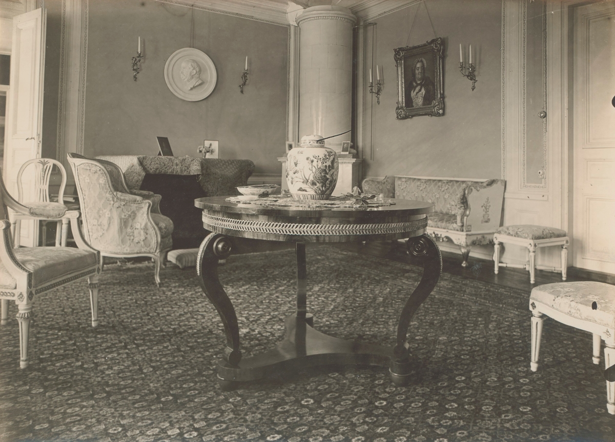 Värnanäs herrgård. Salongen på övervåningen. Runt bord i empire i mahogny med beslag av förgylld brons, blad-kransformit, runt sargen och på benens ytersida upptill.