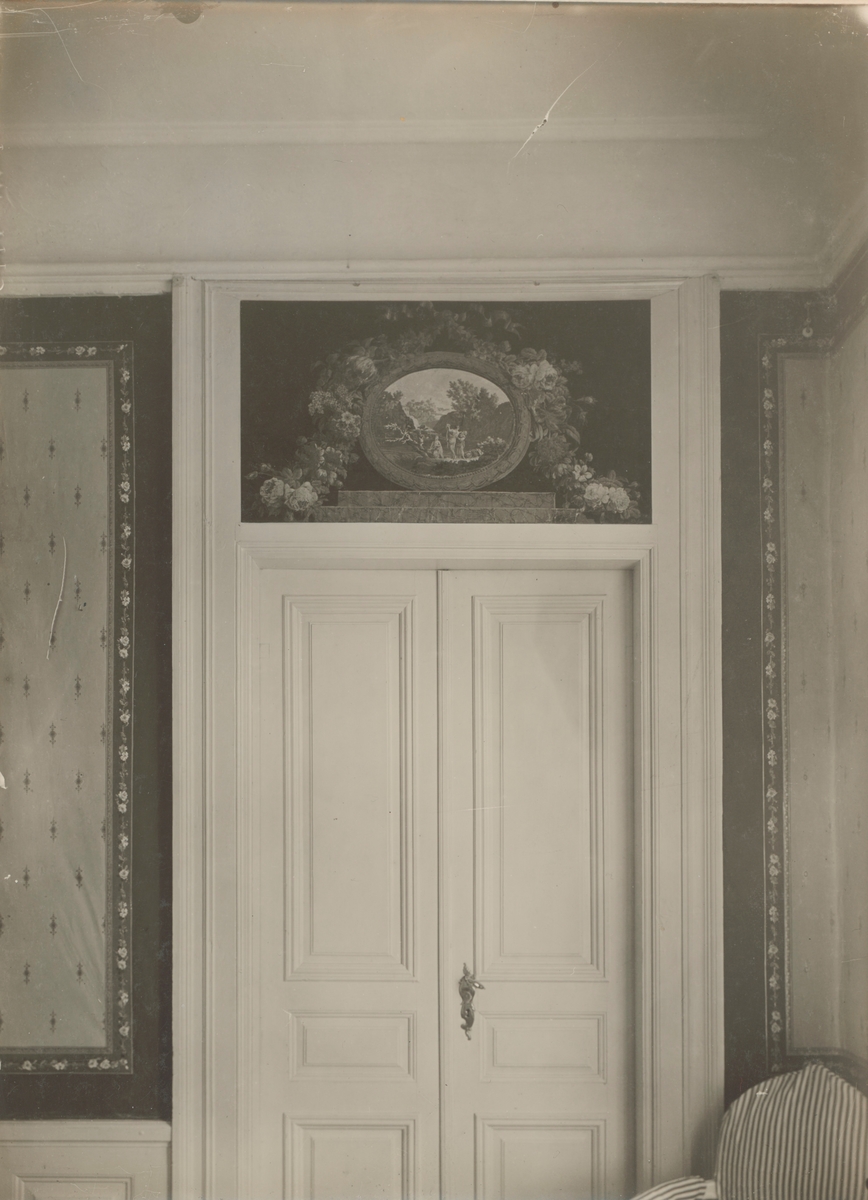Värnanäs herrgård. Sängkammaren på övervåningen. Dörröverstycke tryckt på papper, oval medaljong med landskap i brunt inom gulbrun ram, blomgirland i färger, trappformig sockel i grönt, svart fond., två stycken av samma typ i rummet.