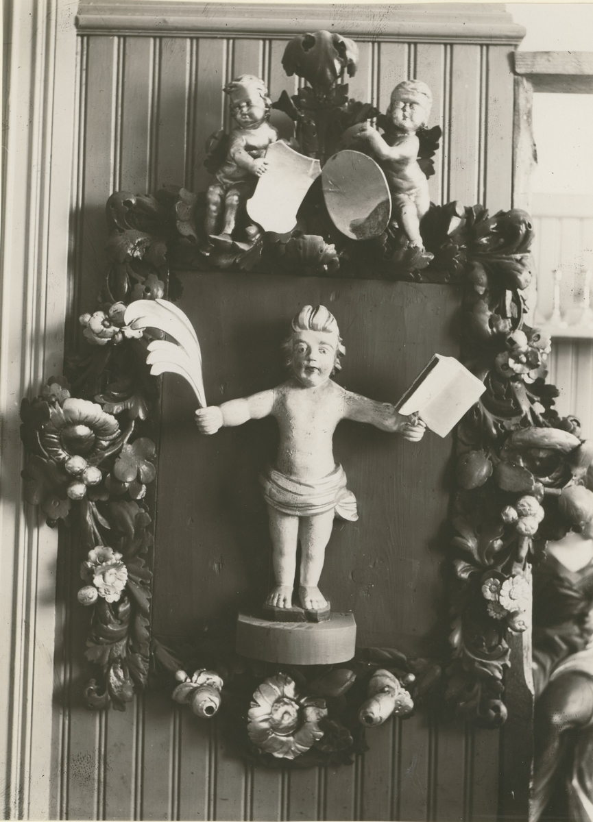 Träskulptur på predikstolen i Tveta kyrka efter restaureringen 1933.