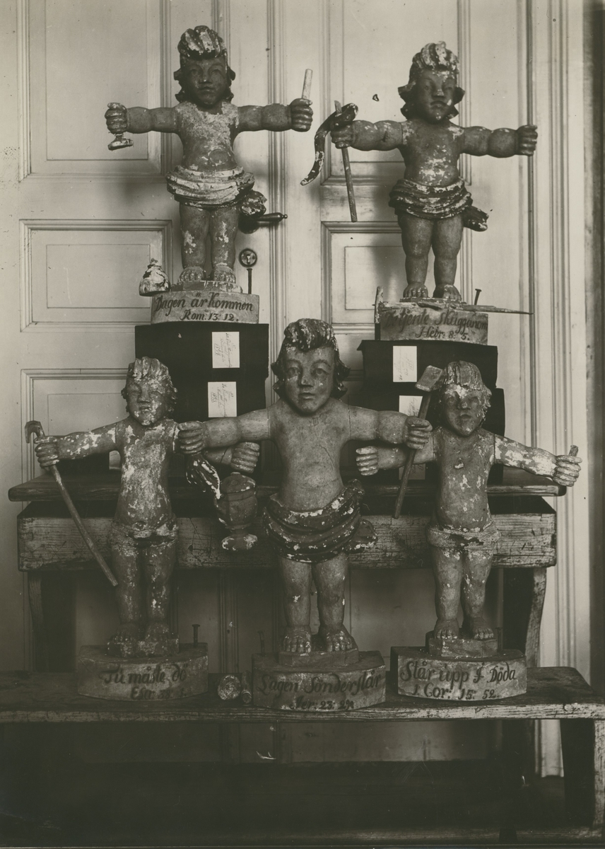 Träskulpturer i Tveta kyrka efter restaureringen 1933.