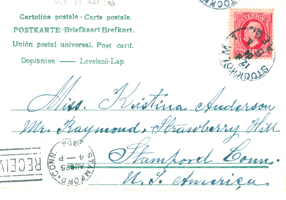 Titel: Ett vykort till Kristina Andersson, Stamford, Connecticut, USA. Det är skrivet av Edvard Nilsson i Böda.