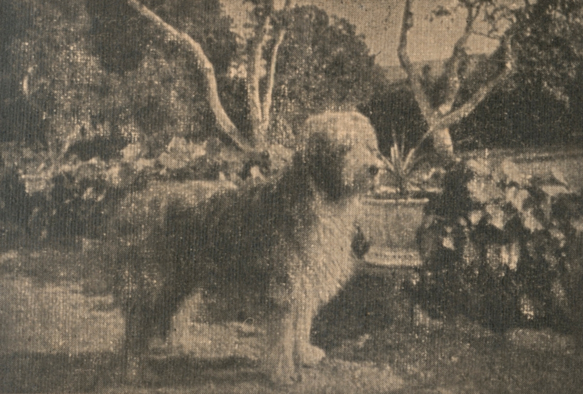 Hund i parkmiljö, foto taget från en bok med ett 80-tal fotografier på familjerna Sparre, Thott, Ehrensvärd med flera.
