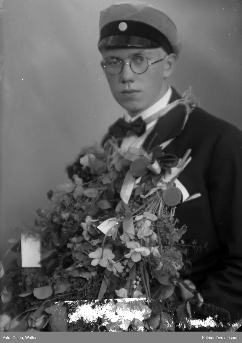 Ateljébild på en man som har tagit realexamen. Han har en blombukett. Enligt Walter Olsons journal är bilden beställd av Allan Klätting.