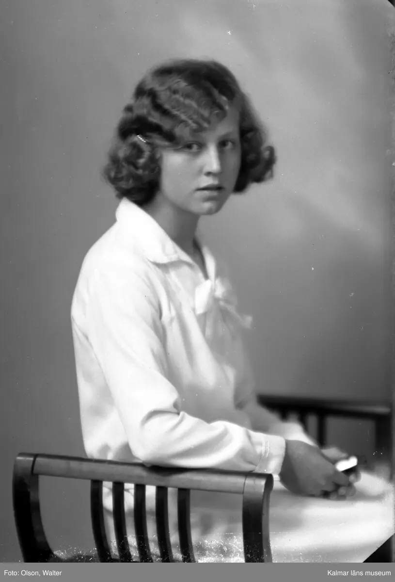 Ateljébild på en kvinna i klänning, sittandes på en pall. Enligt Walter Olsons journal är bilden beställd av Lundin Harriet ifrån Grimskär.