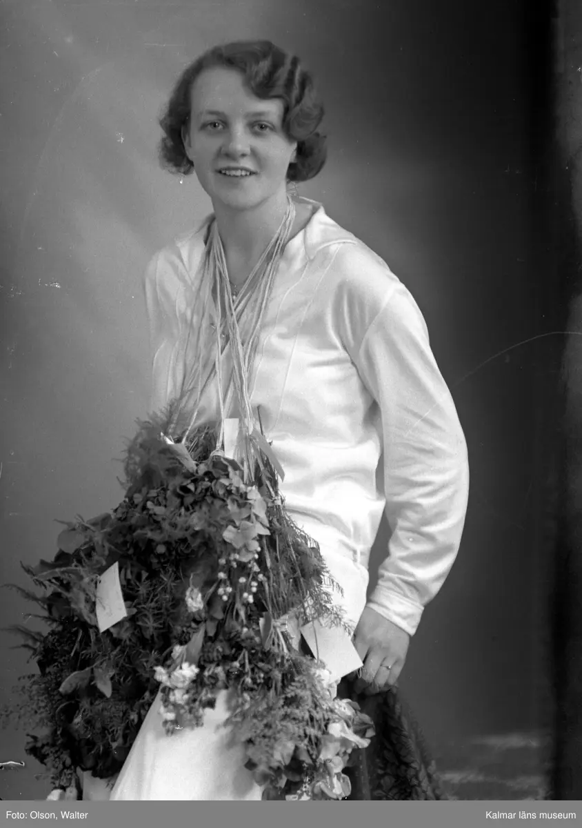 Ateljébild på en kvinna med blommor hängandes runt halsen. Enligt Walter Olsons journal är bilden beställd av fröken Ingrid Andersson.