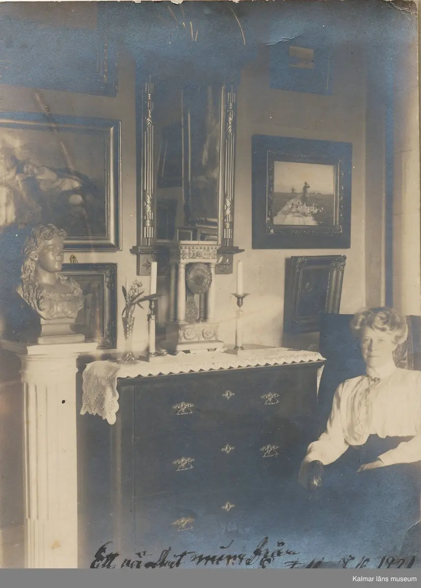 Handskriven text på fotots baksida: .".i hemmet Kammakaregatan 291...vi bodde sedan länge..." [Texten/fotot är avklippt.] Ytterligare ett identiskt foto, med texten "Ett riktigt minne från Estella Julen 1921" finns.