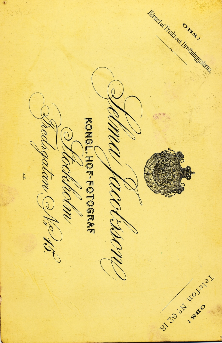 Tryck på fotots baksida: "Selma Jacobsson KONGL. HOF-FOTOGRAF Stockholm Fredsgatan No 15. OBS! Hörnet af Freds och Drottninggatorna. OBS! Telefon No 6218."