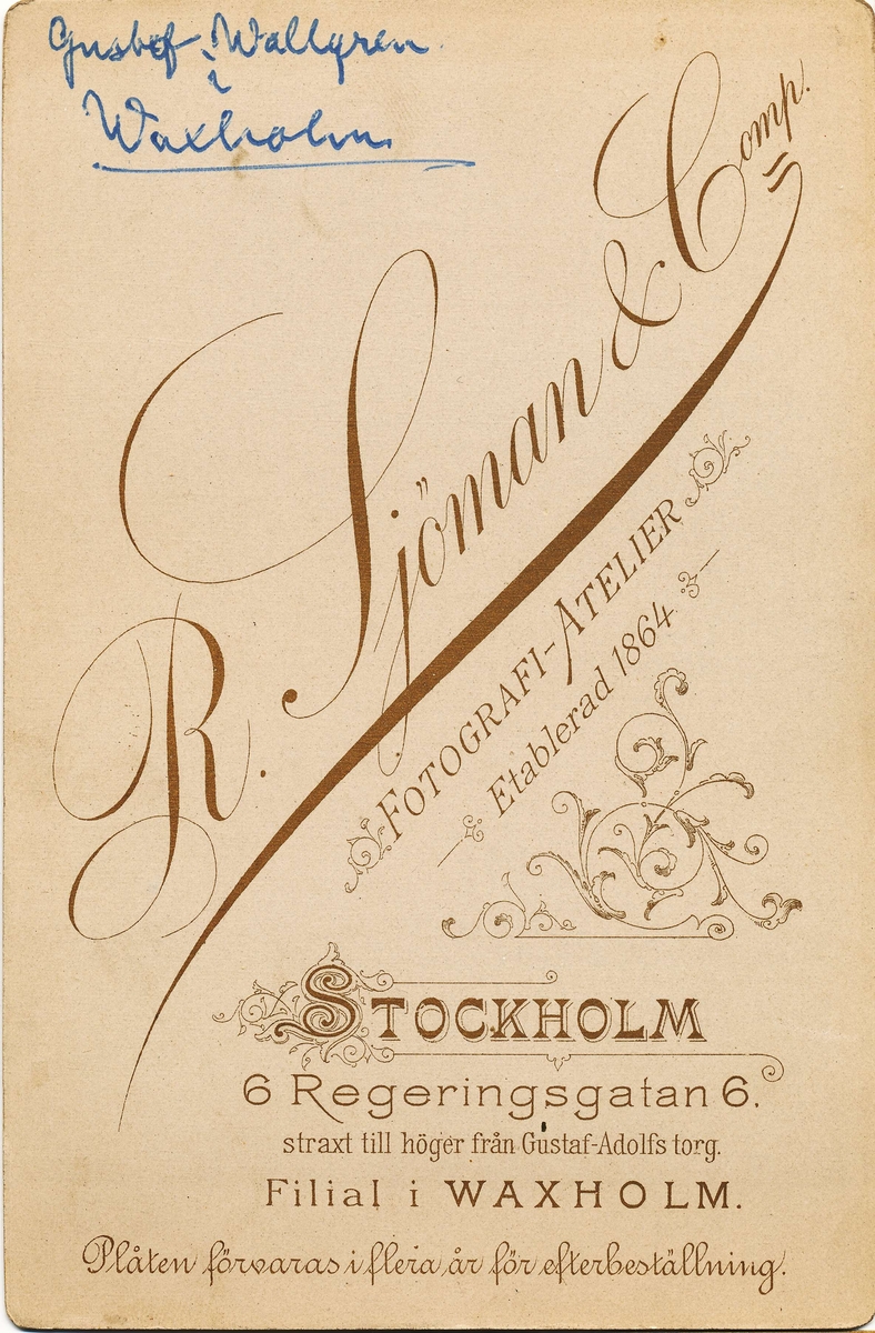 Tryckt text på fotots baksida: "R Sjöman & Comp. Fotografi-Atelier Etablerad 1864 Stockholm 6 Regeringsgatan 6 straxt till höger från Gustaf-Adolfs torg.