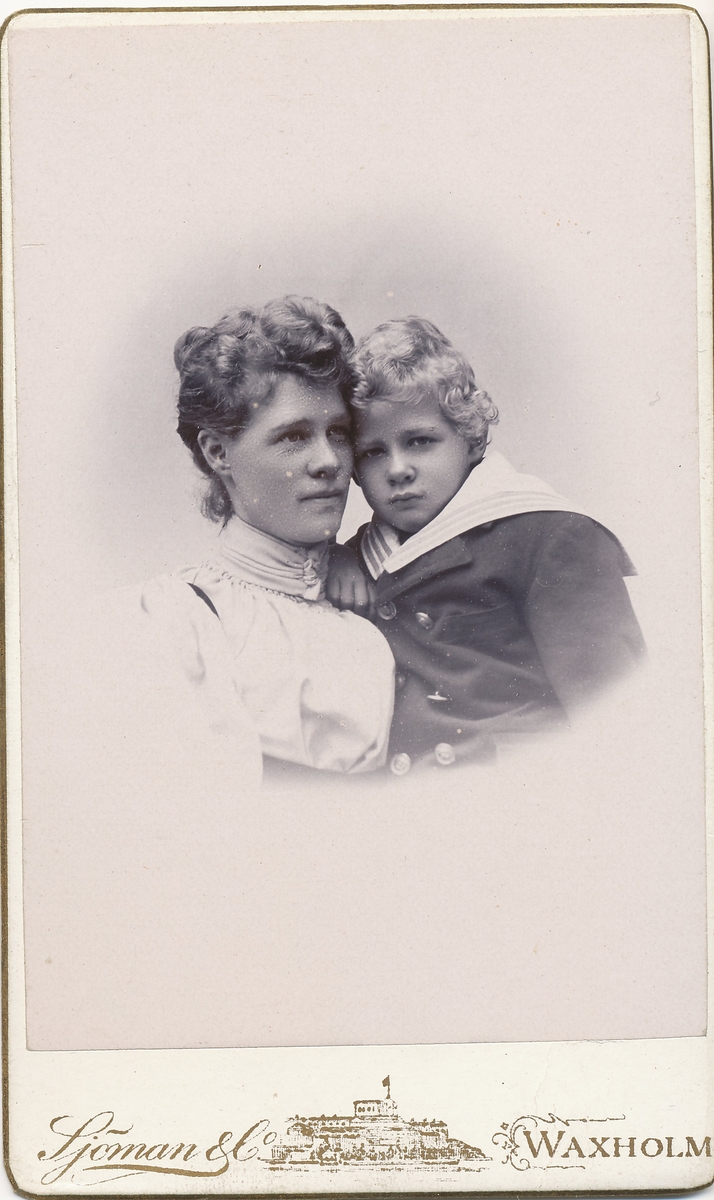 Handskriven text i fotoalbumet, under bilden: "Mamma och Gustaf."