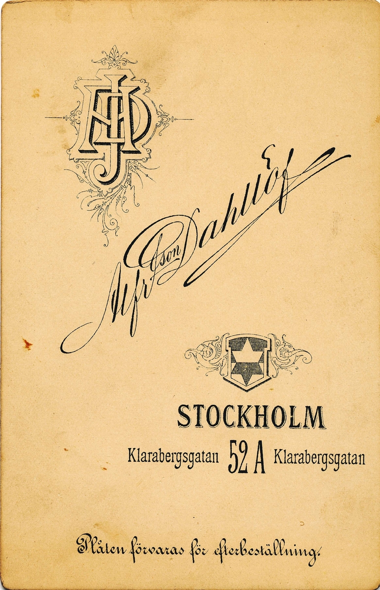 Tryckt text på fotots baksida: "Alfr. Json Dahllöf Stockholm Klarabergsgatan 52a Klarabergsgatan."