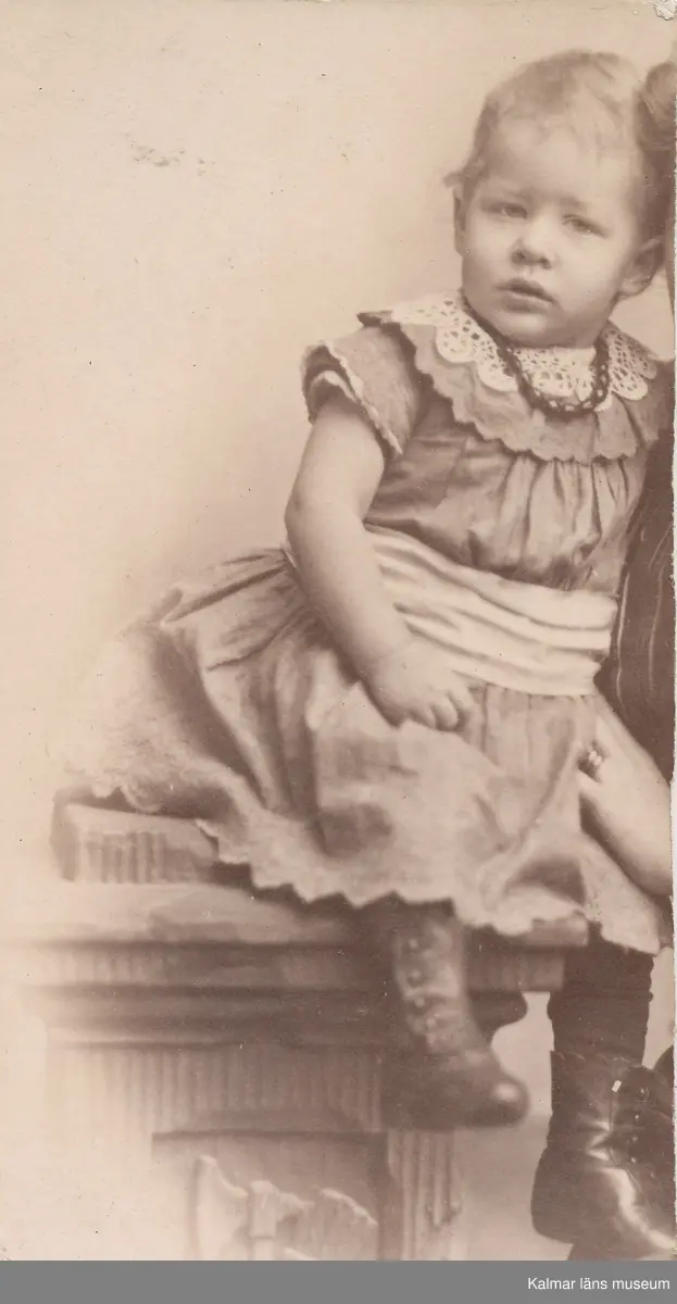 Ett anonymt barn, en flicka, som sitter på en låg pelare. Fotot är avklippt på längden, och man skymtar en kvinna som håller i barnet.