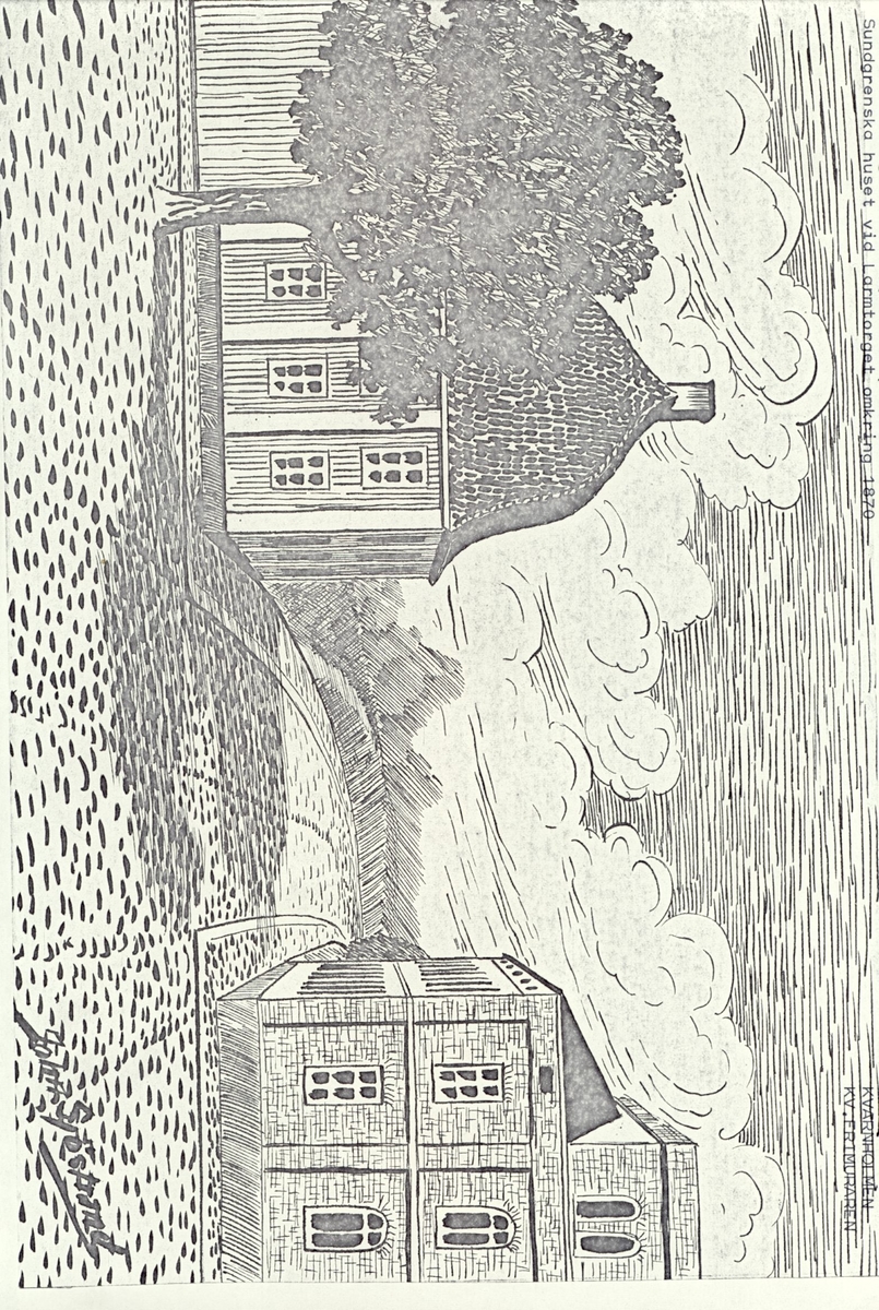 Tuschteckning av John Sjöstrand. Sundgrenska huset vid Larmtorget omkring 1870.