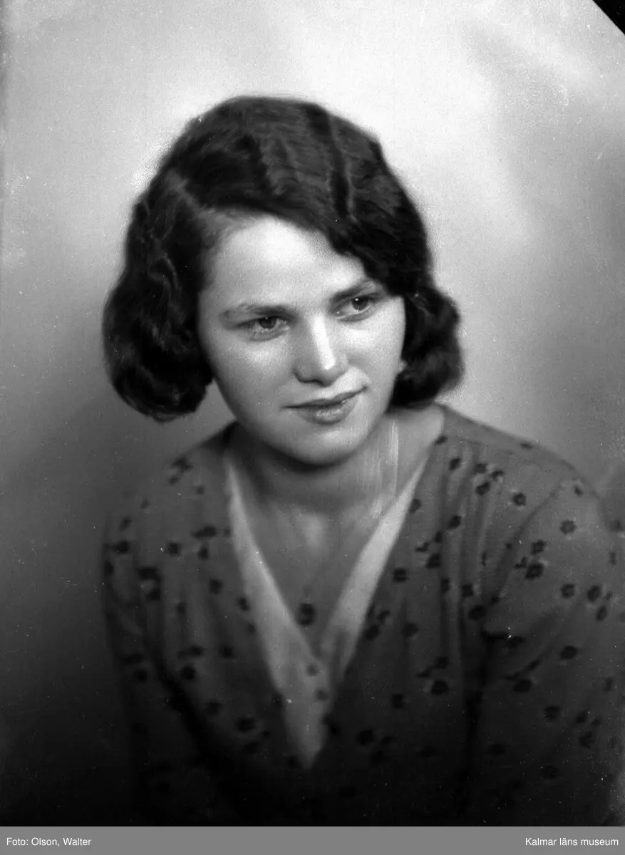 Ateljébild på en kvinna i halsband och ondulering. Enligt Walter Olsons journal är bilden beställd av Sonja Andersson.