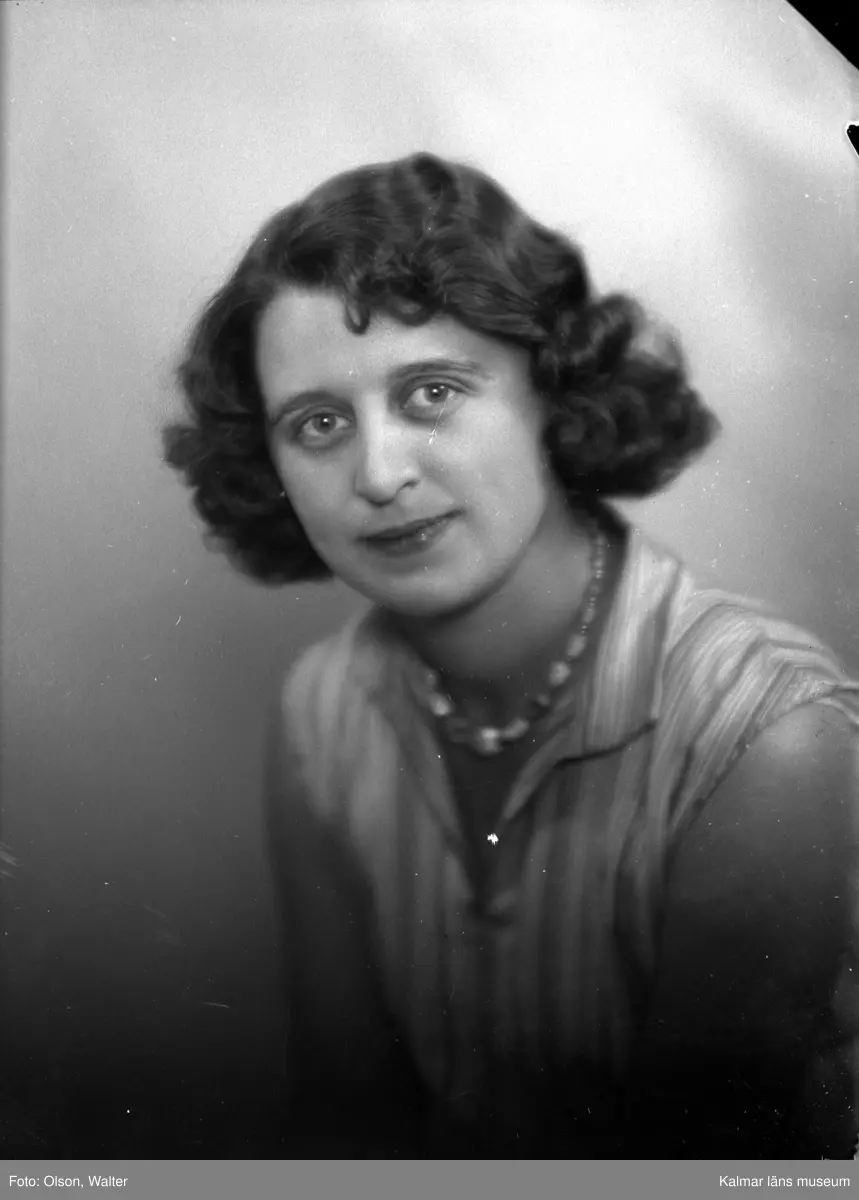 Ateljébild på en kvinna i blus och halsband. Enligt Walter Olsons journal är bilden beställd av fröken Ruth Neikter.