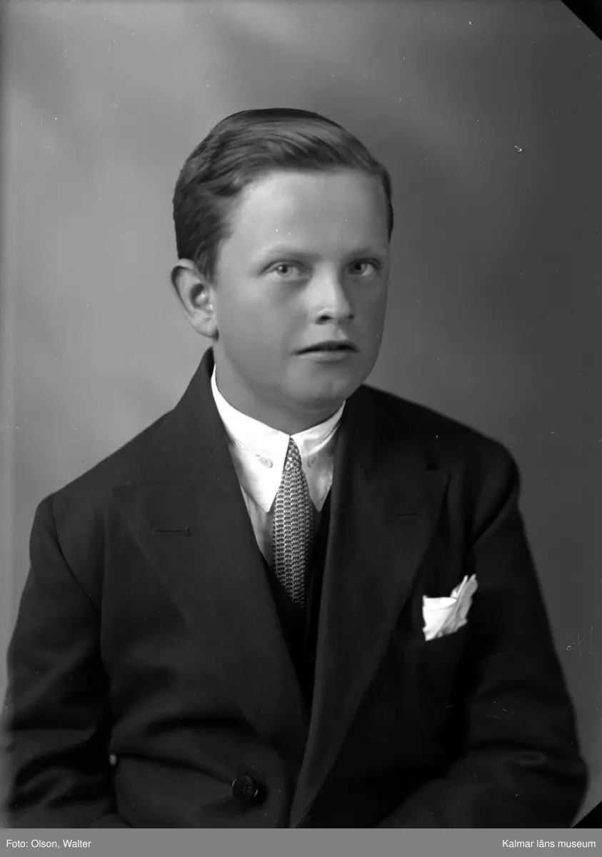 Ateljébild på en pojke i kostym. Enligt Walter Olsons journal är bilden beställd av Gösta Georgsson.