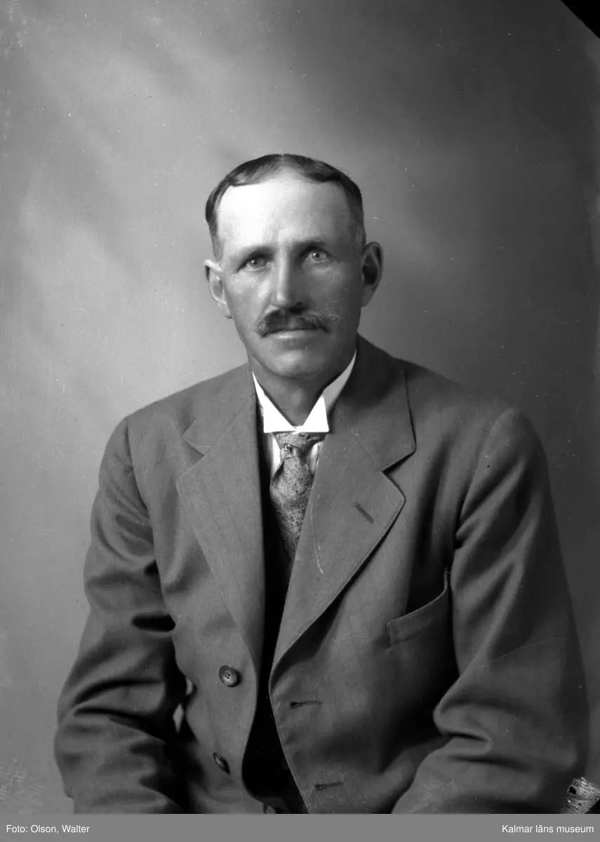 Ateljébild på en man i kostym. Enligt Walter Olsons journal är bilden beställd av herr Einar Johansson.